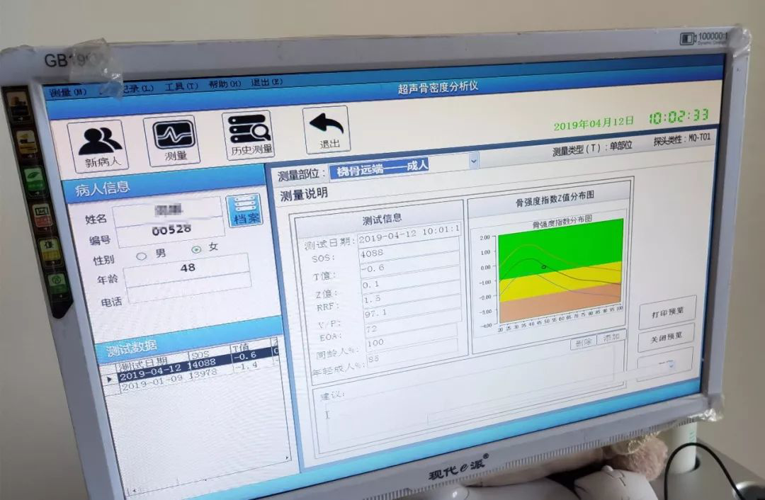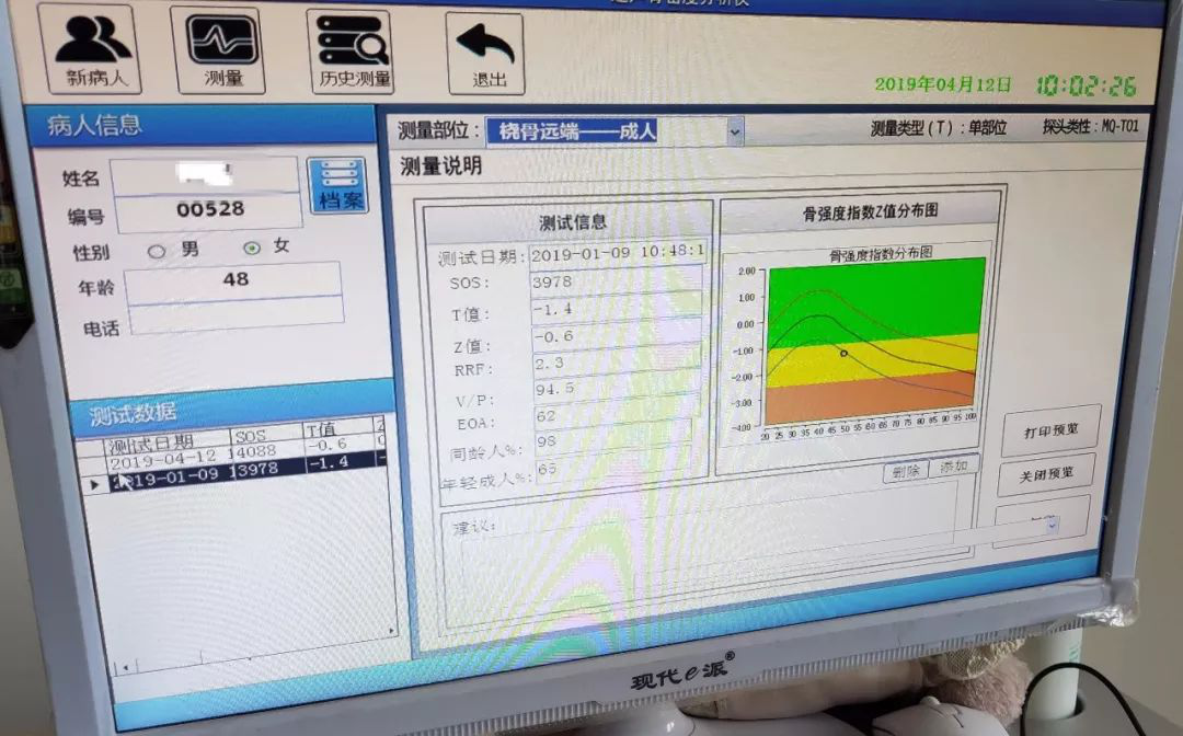 骨密度較低,骨質(zhì)流失檢測報告:圓點(diǎn)在黃色區(qū)域,T=-1.4